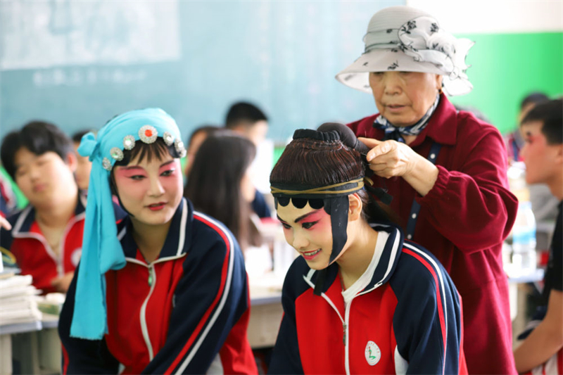 5月6日,在大城县臧屯镇第一中学,戏曲演员在表演戏曲。(刘亮 摄)